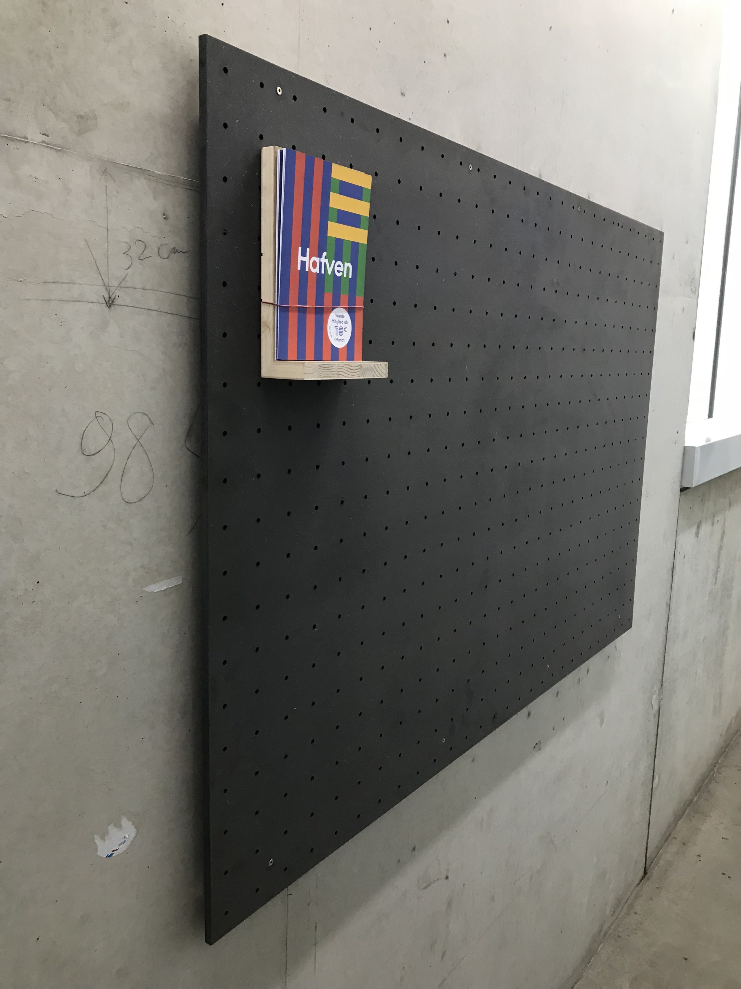 Wir wollen gemeinsam aus vorhandenen Holzresten Flyer-Ständer für den Hafven-Eingangsbereich bauen. Damit wir die losen Flyer von der Fensterbank verbannen können wird es zwei schwarze Bretter mit 5x5cm Lochraster geben. Dafür brauchen wir jede Menge Halter wie auf dem Bild zu sehen.